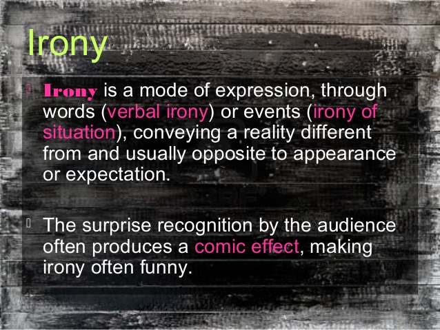 The ability to recognize irony is one of the surest tests of intelligence and sophistication. Irony speaks words of praise to imply blame and words of blame to imply praise. Writer is using a tongue-in-cheek style. Irony is achieved through such techniques as hyperbole and understatement.